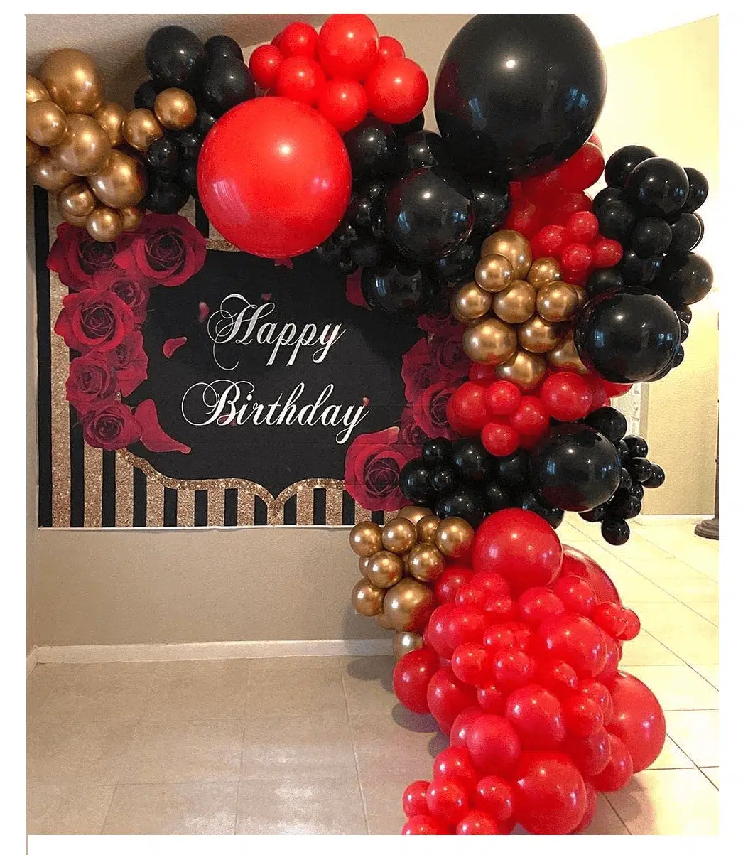 Arcada Gold Negru Rosu este usor de realizat datorita kitului complet de instalare, ideala pentru botez, aniversari, deschideri magazine, diferite evenimente.