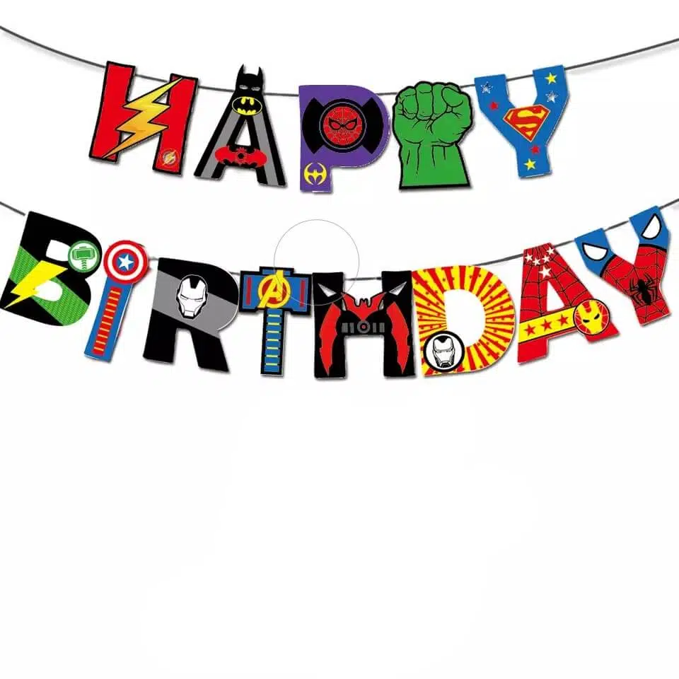 Decoratiune tip banner ce formeaza mesajul HAPPY BIRTHDAY cu Super Eroi precum Batman, Spiderman, Hulk, Superman, Iron Man, Captain America.