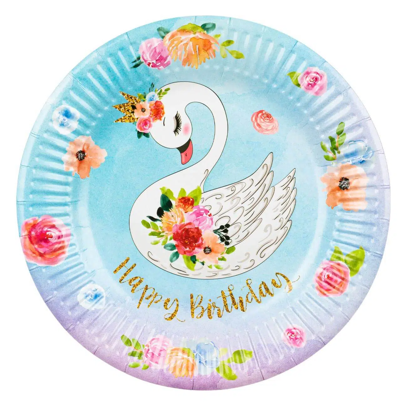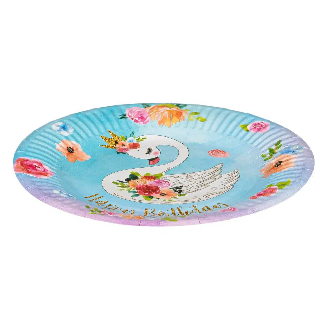Farfurii cu lebede si print floral pentru o petrecere de neuitat, farfuriile sunt decorate cu mesaj „Happy Birthday” gold