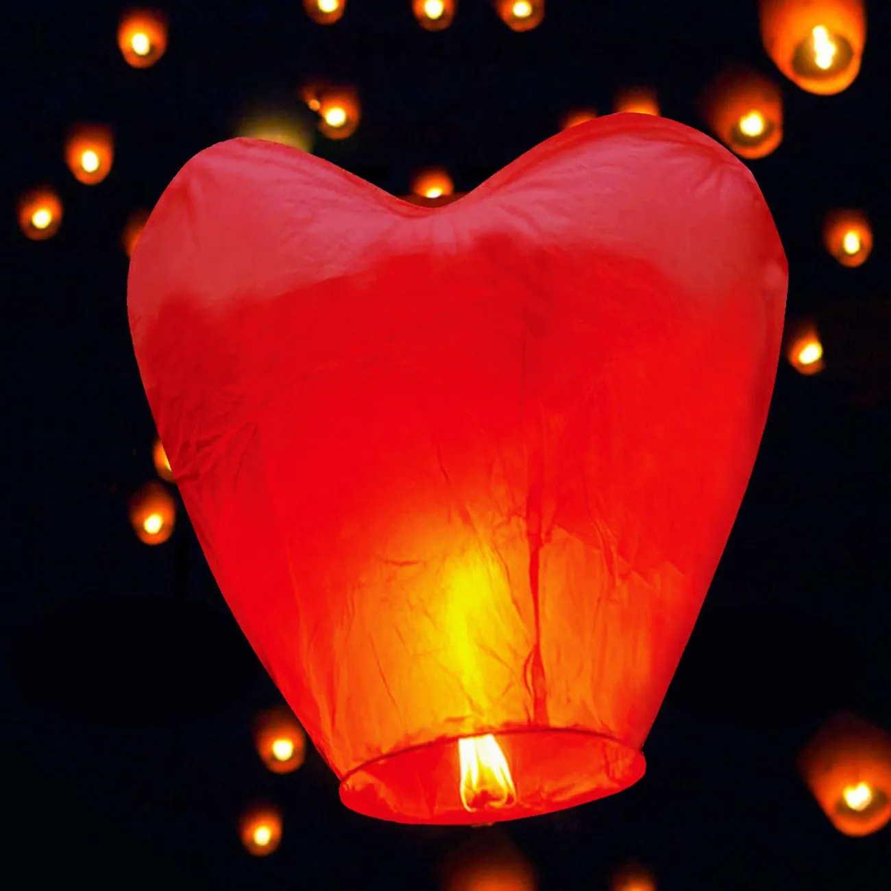 Felinar decorativ zburător, în formă de inimă, fabricat din hârtie roșie. Dimensiuni: 38 × 55 × 96 cm. Timp de ardere estimat: 8-12 minute.