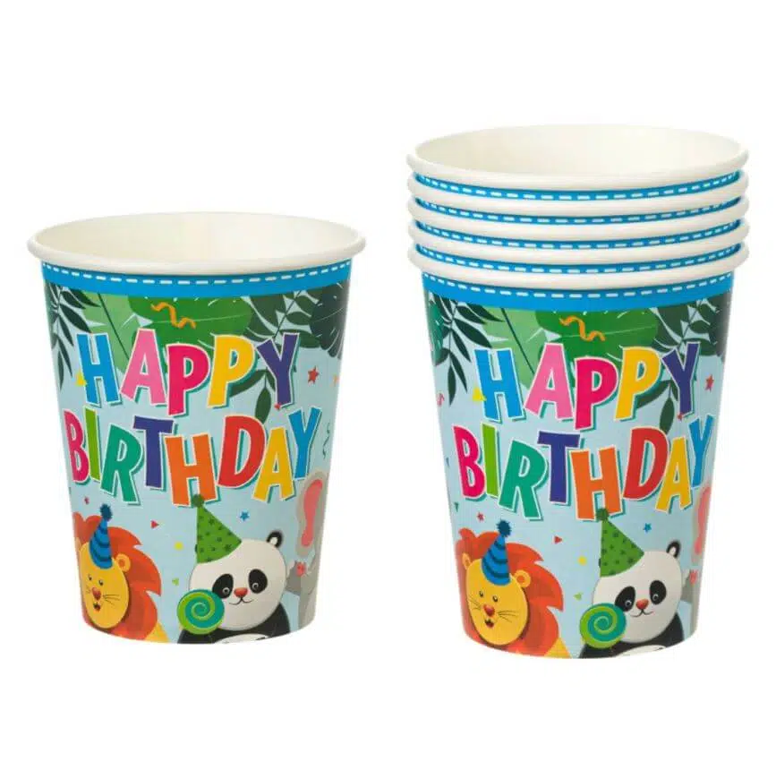 Set pahare multicolore cu animalute din jungla si mesaj Happy birthday multicolor, ideal pentru petreceri tematice si zile de nastere.
