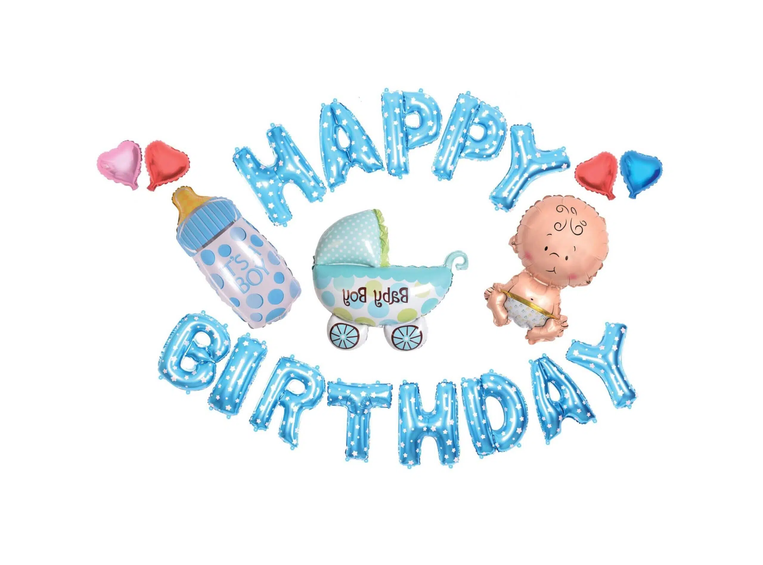 – baloane litere HAPPY BIRTHDAY albastru cu stelute albe 40 cm.