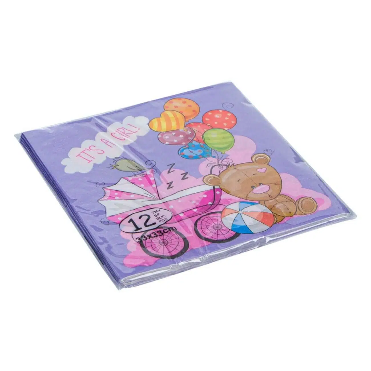 Set servetele lila si roz pentru petreceri, imprimate cu ursulet de plus, baloane si carucior